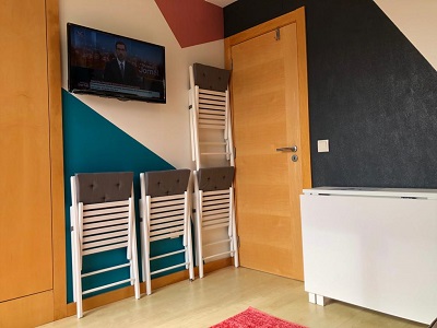 A nossa sala de estar é composta por mesa para 4 pessoas, TV com canais por cabo e sistema de streaming, varanda com mesa de apoio e grelhador. Este espaço tem um sofá-cama (1,40×2,00) e facilmente pode ser transformado num quarto privado.