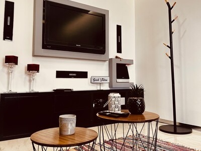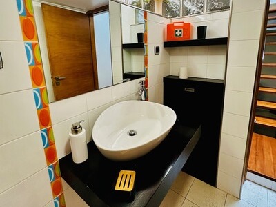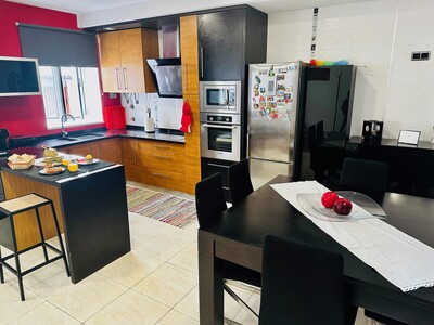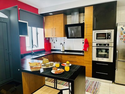Nênê House é composta por 3 pavimentos, sendo que no rés de chão encontrará uma confortável sala de estar equipada com TV (canais por cabo e sistema de streaming) e aparelho de som integrada com a sala de jantar para 6 pessoas e a cozinha completa muito bem equipada com tudo que você irá precisar para preparar deliciosas refeições.